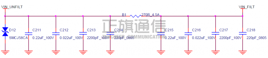 电源输入处的直流电源滤波器及瞬态抑制电路设计示例如下图所示,按照习惯,我们将未滤波的电源网络命名为VIN_UNFILT,滤波后的电源网络命名为VIN_FILT。