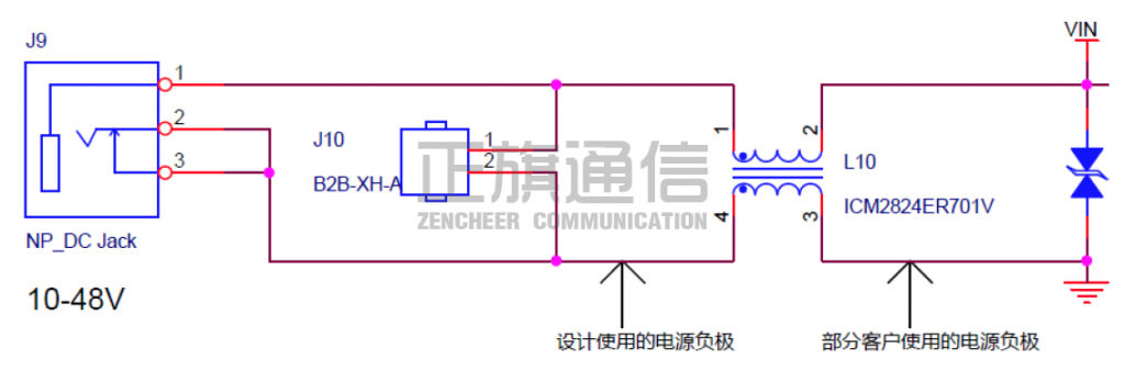 如前所述,我司产品不区分地与外壳地,且部分客户直接使用螺丝孔作为电源负极(地)。如下图所示,L10为电源输入处的共模电感,L10 3、4脚的线圈会被直接调过或短路,L10不起作用,因此在我司产品设计中,电源输入处不使用共模电感作为直流电源滤波器的组件。
