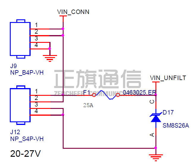F1是额定限流25A的保险丝,D17是大功率瞬态抑制二极管,可承受高达700A的正向峰值导通电流,如果用户将电源接反,F1将迅速熔断,保证内部关键器件不损坏。