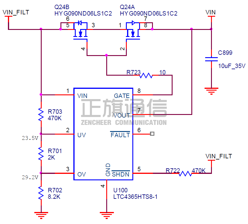 U100同时具备防插反、过压与欠压保护功能,具体工作原理可查看其规格书。Q24是一种双NMOS,由于NMOS的导通电阻很小,Q24可通过高达56A的电流。